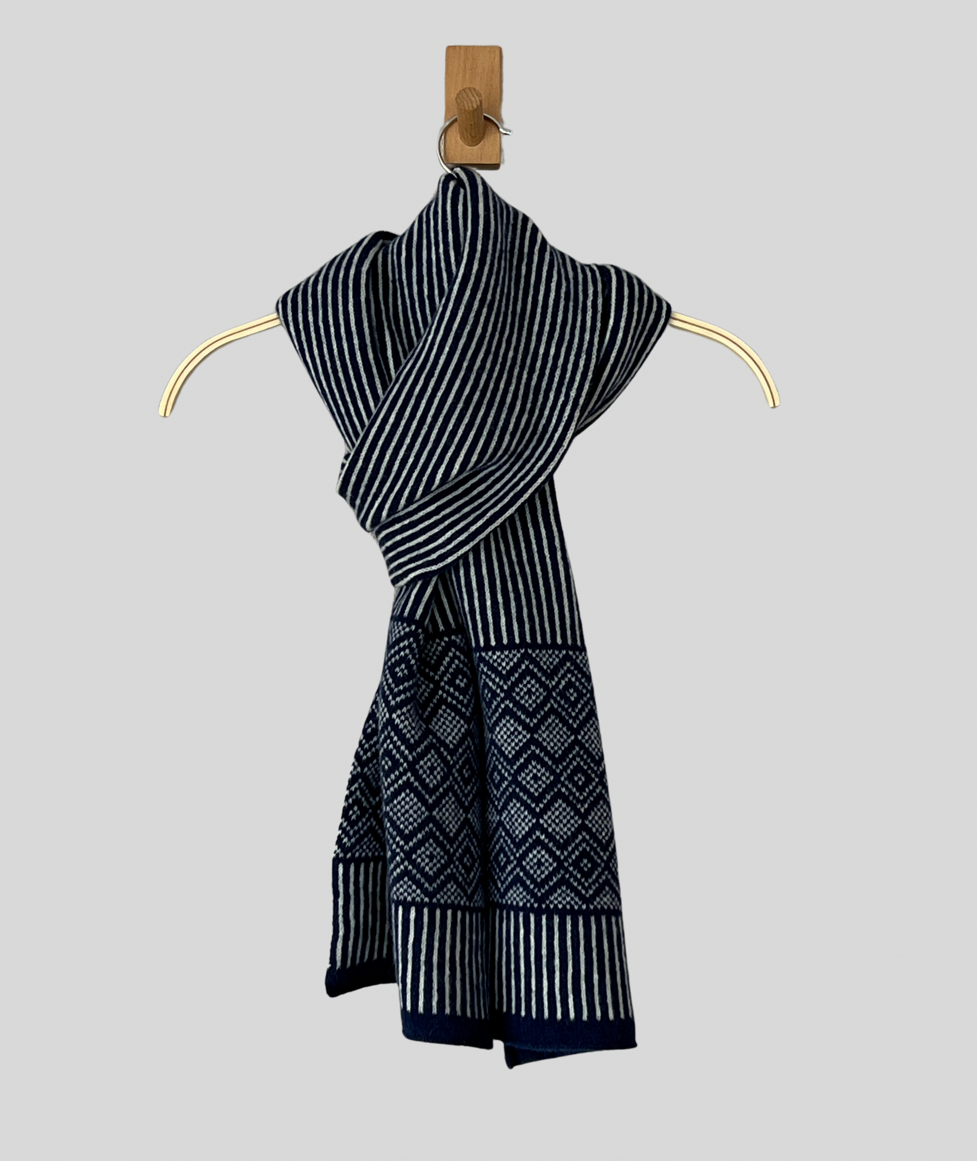 Scarf -soft merino lambswool Scandi pattern with stripes in navy blue and natural white