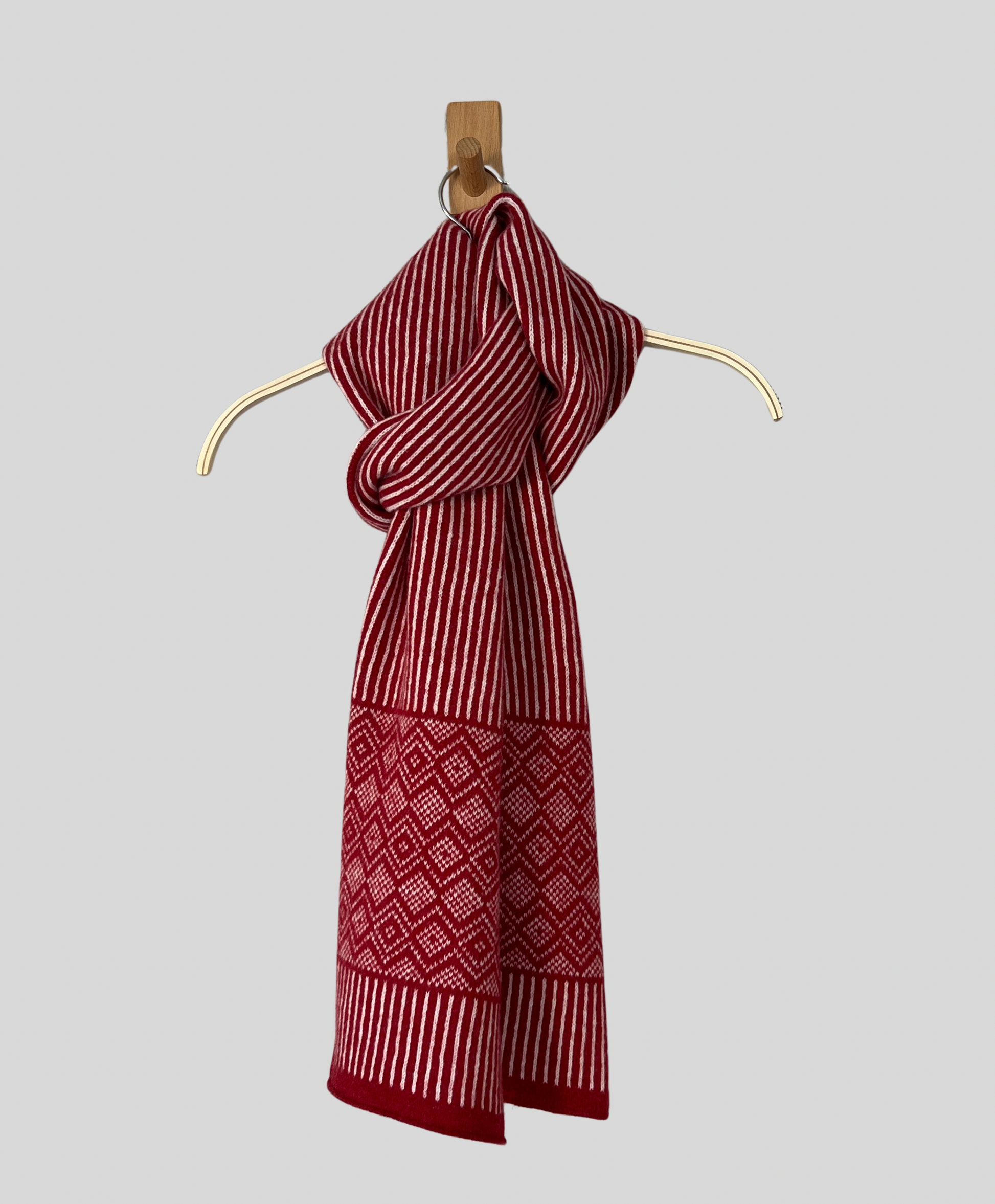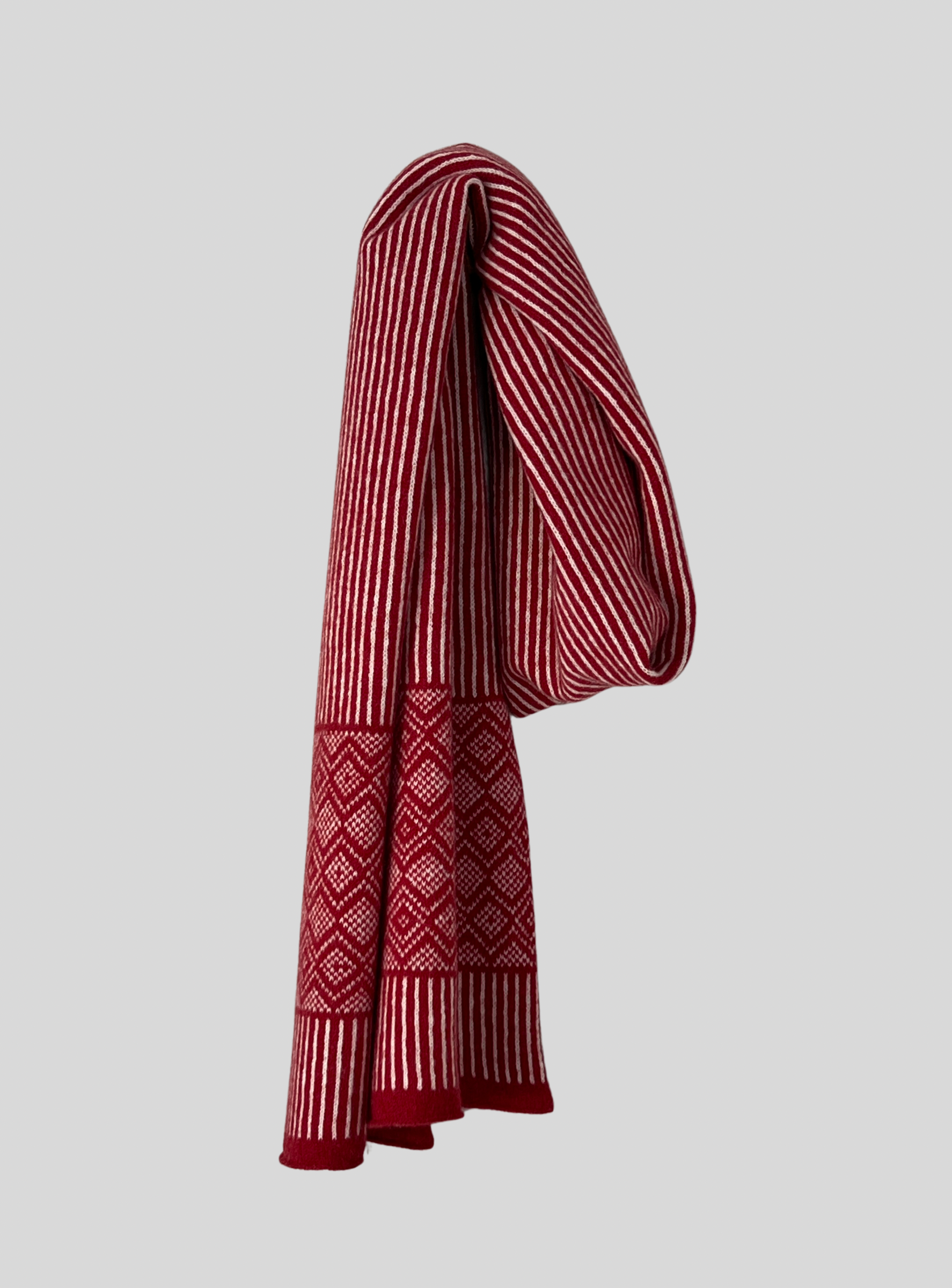 Scarf -soft merino lambswool Scandi pattern with stripes in berry red and natural white